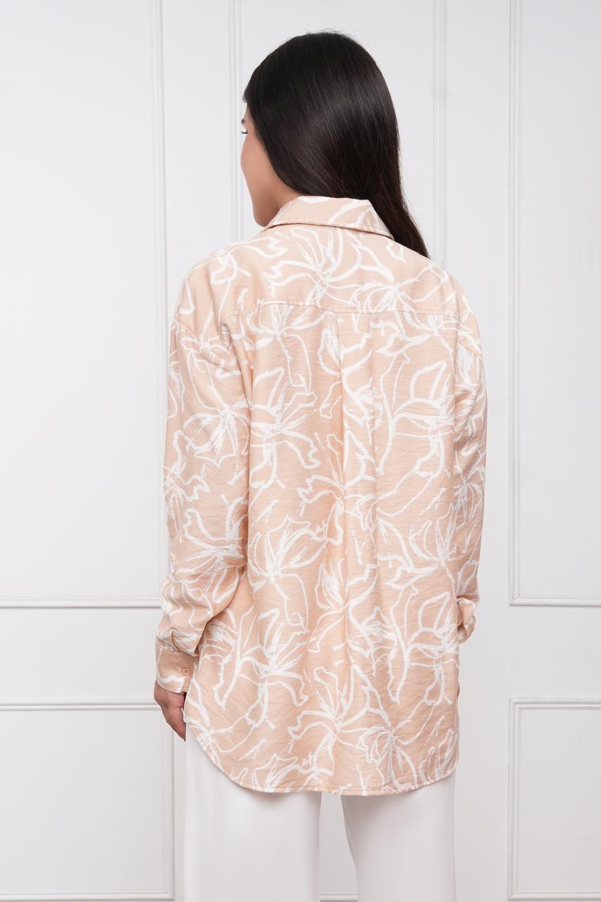 Blusa en tela suave estampada, fit oversize, manga larga con regulador. Detalle de pliegue en la espalda, cuello camisa ruedo con forma redondeada.
